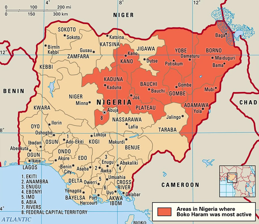 En toen verscheen Boko Haram op het toneel, een ongehoord brutale terreurorganisatie van personen die zich beschouwen als «toegewijd aan de verbreiding van het woord van de profeet en de jihad». Boko Haram is vooral berucht geworden door de talrijke aanslagen en gevallen van kidnapping, meer bepaald de ontvoering op 15 april 2014 van 276 schoolmeisjes. De groepering gebruikt verder alle mogelijke vormen van geweld. «Haar capaciteiten namen toe in 2014, toen de organisatie haast dagelijks aanvallen uitvoerde op christenen, politie- en veiligheidsdiensten, scholen, politici en moslims die als collaborateurs bestempeld werden. Boko Haram verhoogde zijn internationale profiel in 2015 door trouw te zweren aan Islamitische Staat in Irak en de Levant […] en zelfmoordaanslagen uit te voeren in buurland Tsjaad» (Counterterrorism Guide, 2015).