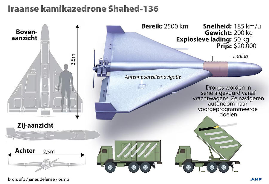 «“De strategie van Iran is gebaseerd op het sturen van goedkope drones die de VS met dure onderscheppingsraketten moeten neerschieten”, aldus Colin Clarke, uitvoerend directeur van het Soufan Center. “Teheran probeert een tactiek van ‘dood door duizend papiersneden’ (Death by a Thousand Paper Cuts) te volgen om de Amerikaanse en Israëlische verdediging te verzwakken» (Ellen Mitchell, America’s military has an Iranian drone problem, 7 maart 2026).
