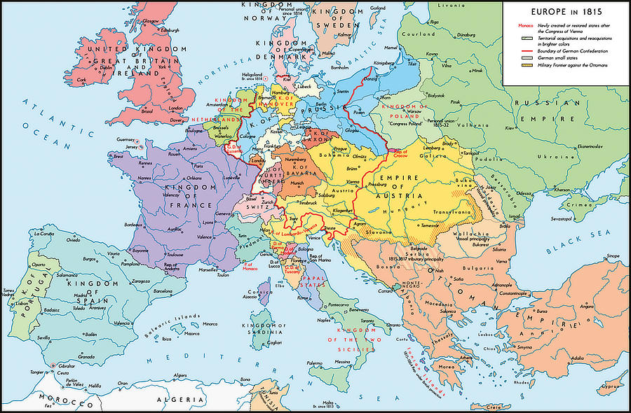 Vanuit zijn “ splendid isolation ” waakte het Verenigd Koninkrijk, heerser over de wereldzeeën, over de machtsbalans op het continent. Frankrijk werd weer de traditionele zeshoek en kreeg twee bufferstaten aan zijn grenzen : in het noorden het Koninkrijk der Nederlanden, in het zuidoosten Piëmont-Sardinië. Oostenrijk, hersteld als keizerrijk, domineerde Centraal-Europa en kreeg een uitweg naar de zee. Pruisen verwierf extra gebieden in het westen, waardoor het binnen de Duitse Confederatie de rivaal van Oostenrijk werd en de kiemen gelegd werden voor een fatale confrontatie.